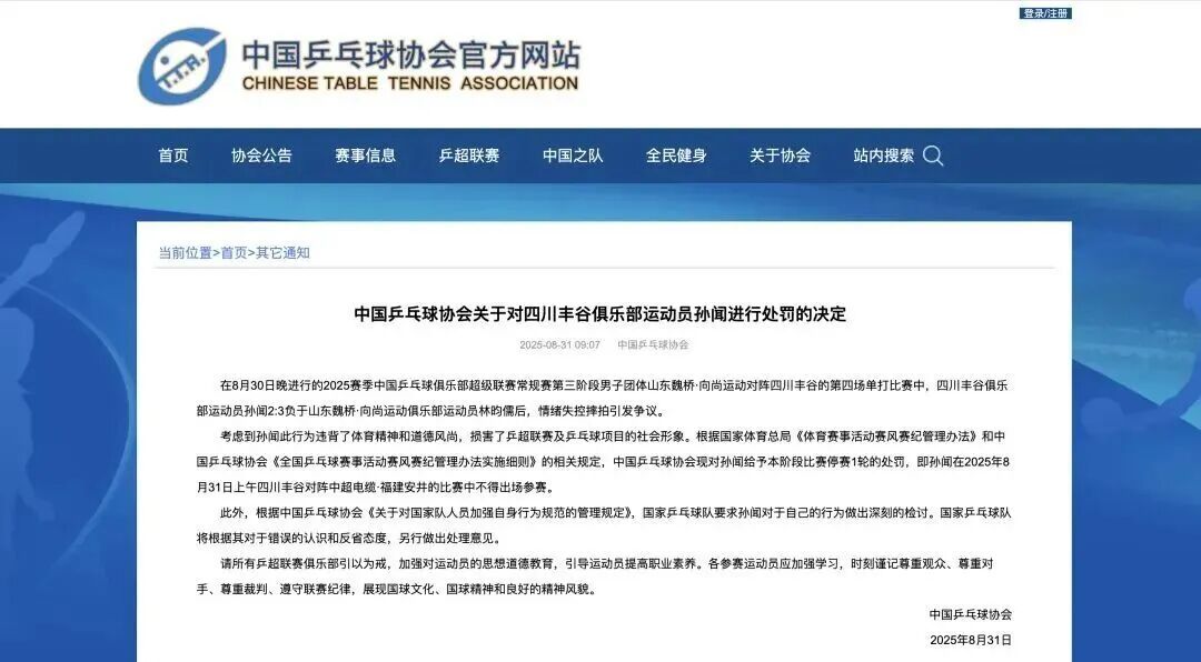 考虑到孙闻此行为违背了体育精神和道德风尚,损害了乒超联赛及乒乓球项目的社会形象。根据国家体育总局《体育赛事活动赛风赛纪管理办法》和中国乒乓球协会《全国乒乓球赛事活动赛风赛纪管理办法实施细则》的相关规定,中国乒乓球协会现对孙闻给予本阶段比赛停赛1轮的处罚,即孙闻在2025年8月31日上午四川丰谷对阵中超电缆·福建安井的比赛中不得出场参赛。